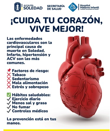 En el municipio de Soledad, las enfermedades cardiovasculares continúan siendo la principal causa de muerte, afectando a cientos de familias cada año. Entre las más frecuentes se encuentran el infarto, la hipertensión arterial y el accidente cerebrovascular (ACV), condiciones que muchas veces se pueden prevenir con pequeños cambios en el estilo de vida.