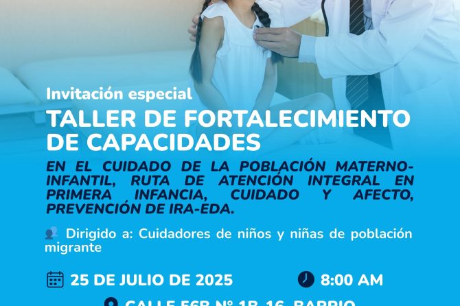 La Alcaldía de Soledad, la Secretaría de Salud, la Gobernación del Atlántico y el Hospital Materno Infantil te invitan al Taller de Fortalecimiento de Capacidades en el cuidado de la población materno-infantil. Un espacio pensado para cuidadores de niños y niñas de población migrante, donde se abordarán temas clave como:
