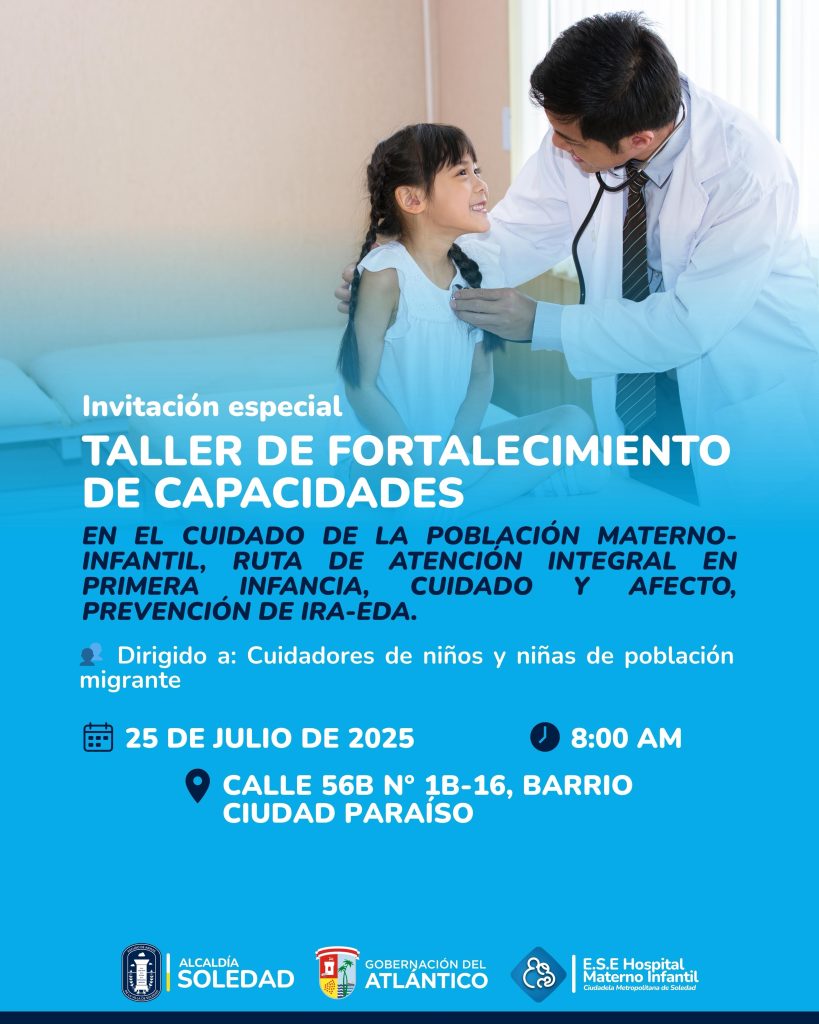 La Alcaldía de Soledad, la Secretaría de Salud, la Gobernación del Atlántico y el Hospital Materno Infantil te invitan al Taller de Fortalecimiento de Capacidades en el cuidado de la población materno-infantil. Un espacio pensado para cuidadores de niños y niñas de población migrante, donde se abordarán temas clave como: