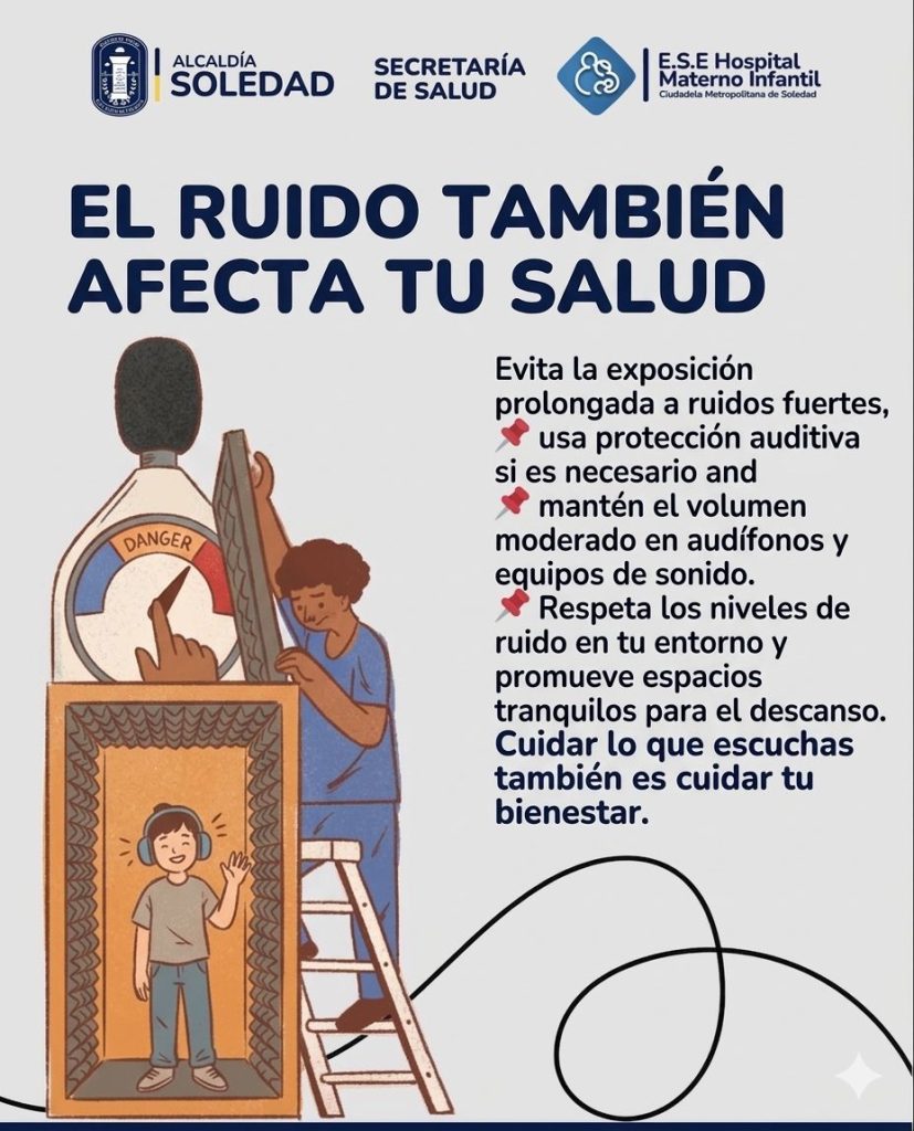 👂 En la Alcaldía de Soledad, la Secretaría de Salud y el E.S.E. Hospital Materno Infantil, sabemos que el bienestar no solo se trata de lo que vemos o sentimos físicamente, sino también de lo que escuchamos. La contaminación auditiva es un riesgo silencioso que puede afectar seriamente tu calidad de vida.