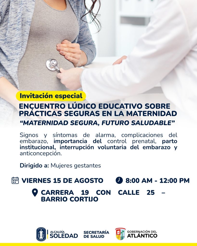 La Alcaldía de Soledad, a través de la Secretaría de Salud y en articulación con la Gobernación del Atlántico, te invita al Encuentro lúdico educativo sobre prácticas seguras en la maternidad: “Maternidad segura, futuro saludable” En este espacio aprenderás sobre: