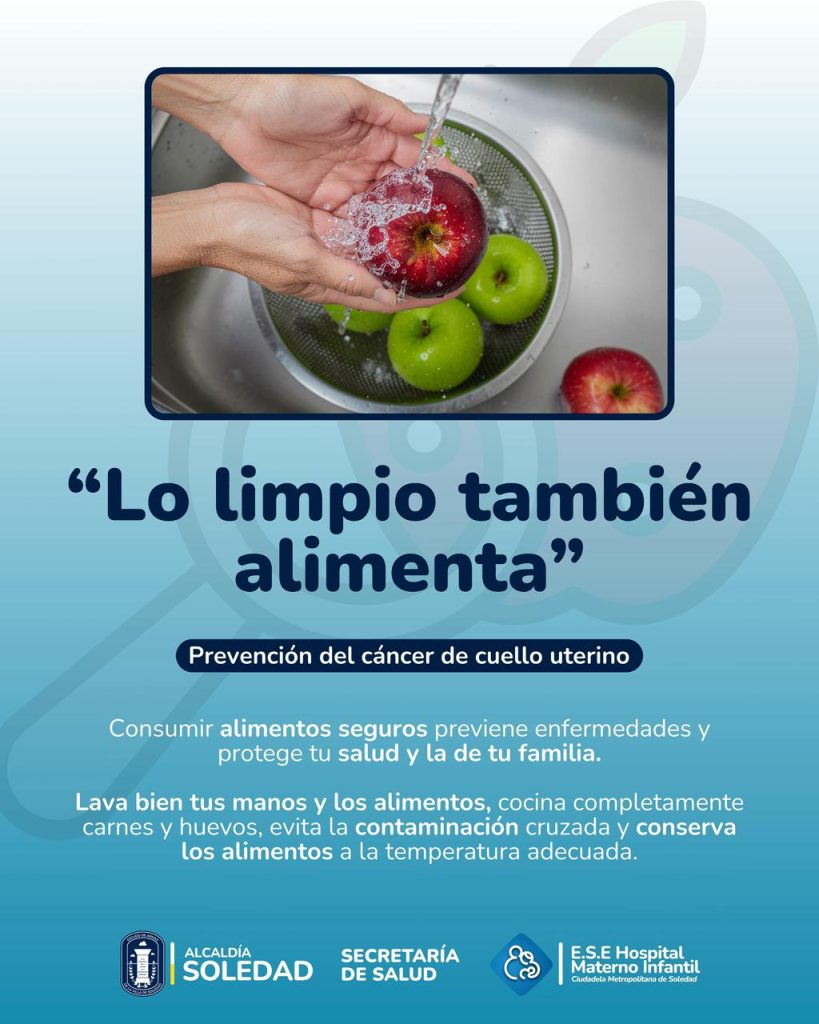 Consumir alimentos seguros es la primera barrera para prevenir enfermedades y proteger el bienestar de tu familia. Desde la Alcaldía de Soledad y la Secretaría de Salud, te recordamos que «Lo limpio también alimenta».