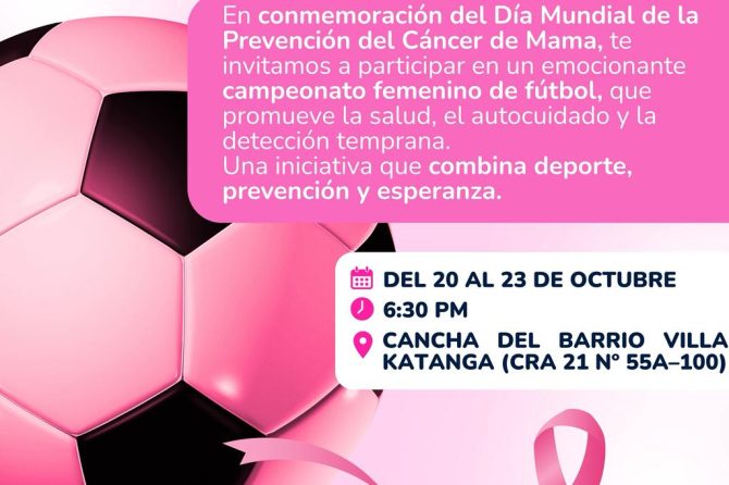 Soledad, octubre 19 de 2025. En el marco del mes de la conmemoración de la lucha contra el Cáncer de mama, la Alcaldía de Soledad en articulación con la Secretaría de Salud, la Oficina de Salud Pública y el Plan de Intervenciones Colectivas del Hospital Materno Infantil, desarrollará el campeonato de fútbol femenino “Sácale tarjeta Rosada al Cáncer de Mama, del 20 al 23 de octubre del año en curso, en la cancha del barrio Villa Katanga.
