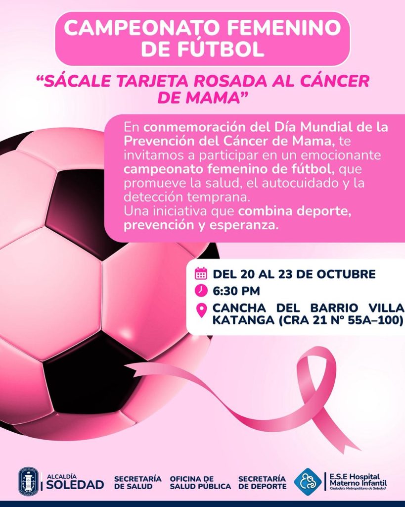 Soledad, octubre 19 de 2025. En el marco del mes de la conmemoración de la lucha contra el Cáncer de mama, la Alcaldía de Soledad en articulación con la Secretaría de Salud, la Oficina de Salud Pública y el Plan de Intervenciones Colectivas del Hospital Materno Infantil, desarrollará el campeonato de fútbol femenino “Sácale tarjeta Rosada al Cáncer de Mama, del 20 al 23 de octubre del año en curso, en la cancha del barrio Villa Katanga.