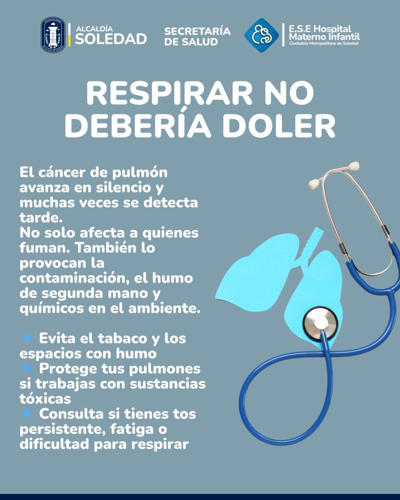 Respirar vida es nuestro derecho. 🫁 El cáncer de pulmón no solo afecta a fumadores; la contaminación y el humo ajeno también son riesgos. Protege tus pulmones y consulta ante cualquier tos persistente o fatiga. ¡Tu salud respira prevención! 🚫🚬
